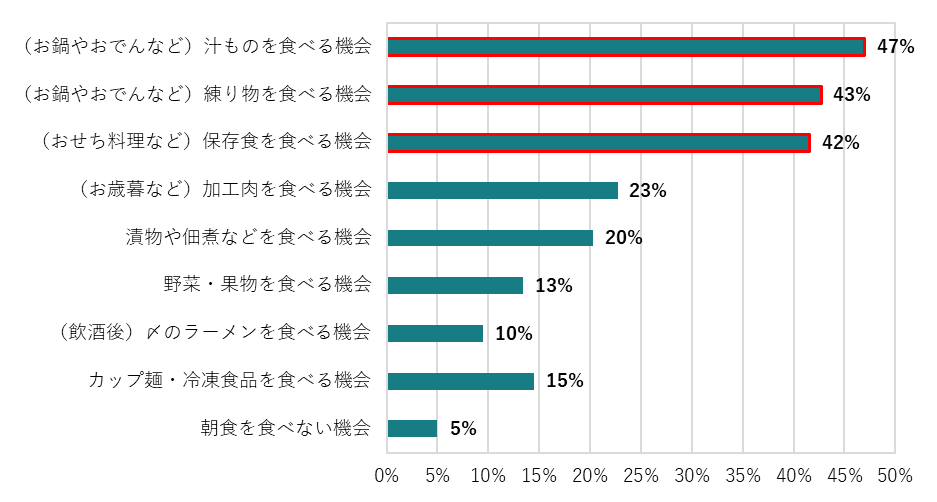 普段と比較して冬に増える、血圧に悪影響がある食事習慣1位は「(お鍋やおでんなど)汁もの(47.0%)」、次いで「(お鍋やおでんなど)練り物(42.7%)」、「(おせち料理など)保存食(41.6%)」でした。その理由を尋ねたところ、「家族、親族で集まる機会が増えるから(51.4%)」がトップという結果となりました。