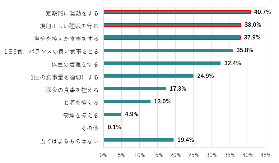 「規則正しい睡眠を守る(38.0%)」、「塩分を控えた食事をする(37.9%)」がトップ3となりました。